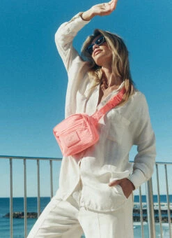 - Closure: Small zippered front pocket with zipper closure + plastic buckle strap closure