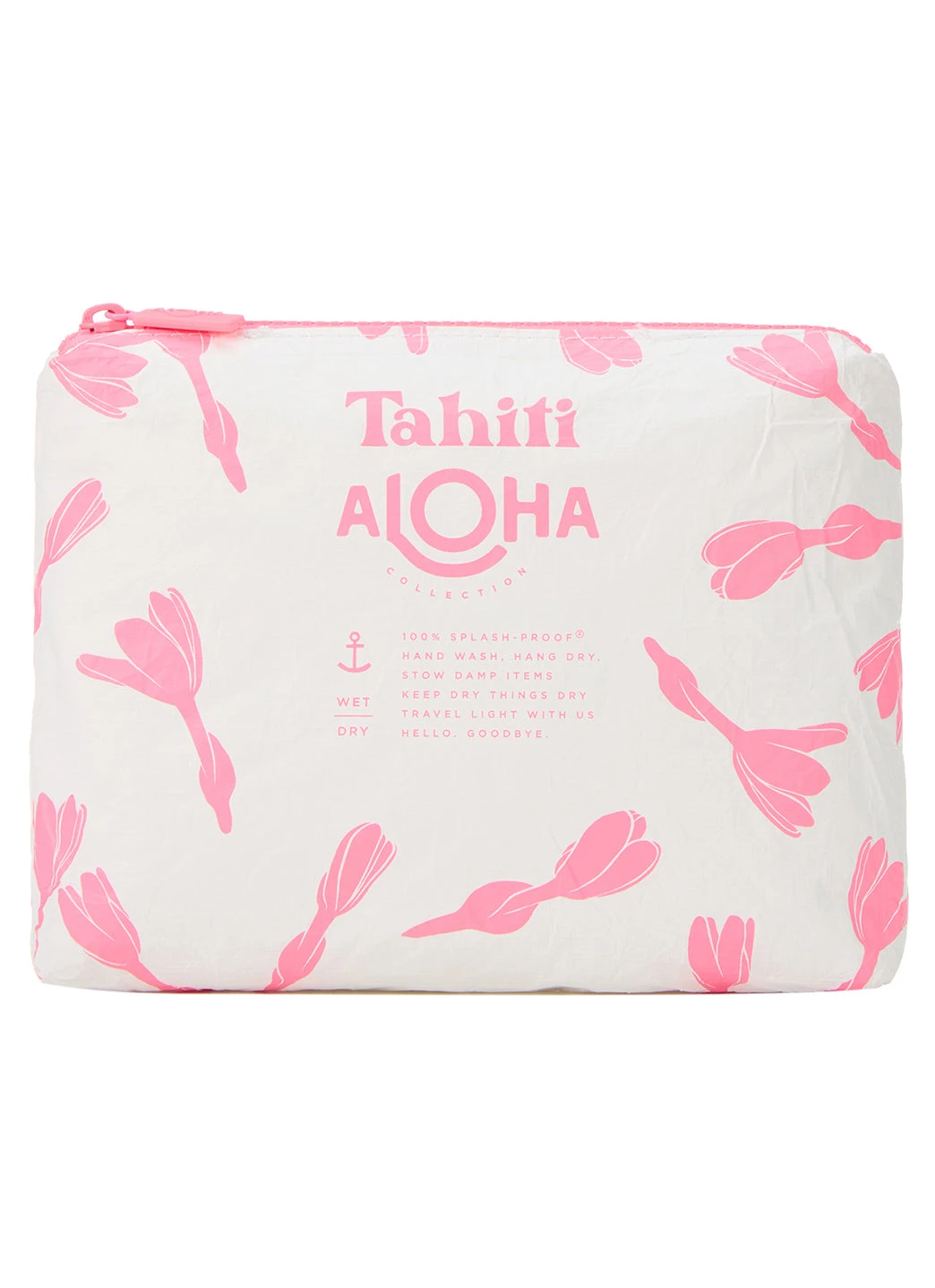 SPLASH-PROOF® is the next best thing to waterproof! Your belongings will be protected from a light splash, light rain, or a cocktail spillage, but please do not submerge your ALOHA Collection pouch with belongings inside. The zipper and seams of ALOHA Collection bags are not watertight.