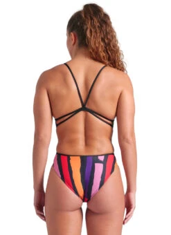 Express your creativity in the arena Women’s Painters Stripe Lace Back One Piece Swimsuit, styled in vibrant stripes on MaxLife Eco material. Its open lace back and high-cut leg elevate both aesthetics and performance.