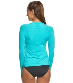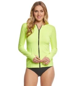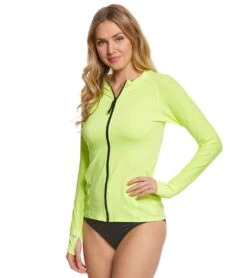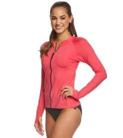 Rashguards should flatters as well as they function. The Beach House Women’s Beach Solids Ava Front Zip Long Sleeve Rashguard provides great sun protection, has a soft feel, stretches 4-ways and breathes amazingly. It stretches past the hips for a fuller, more stylish look with an imbedded pattern.