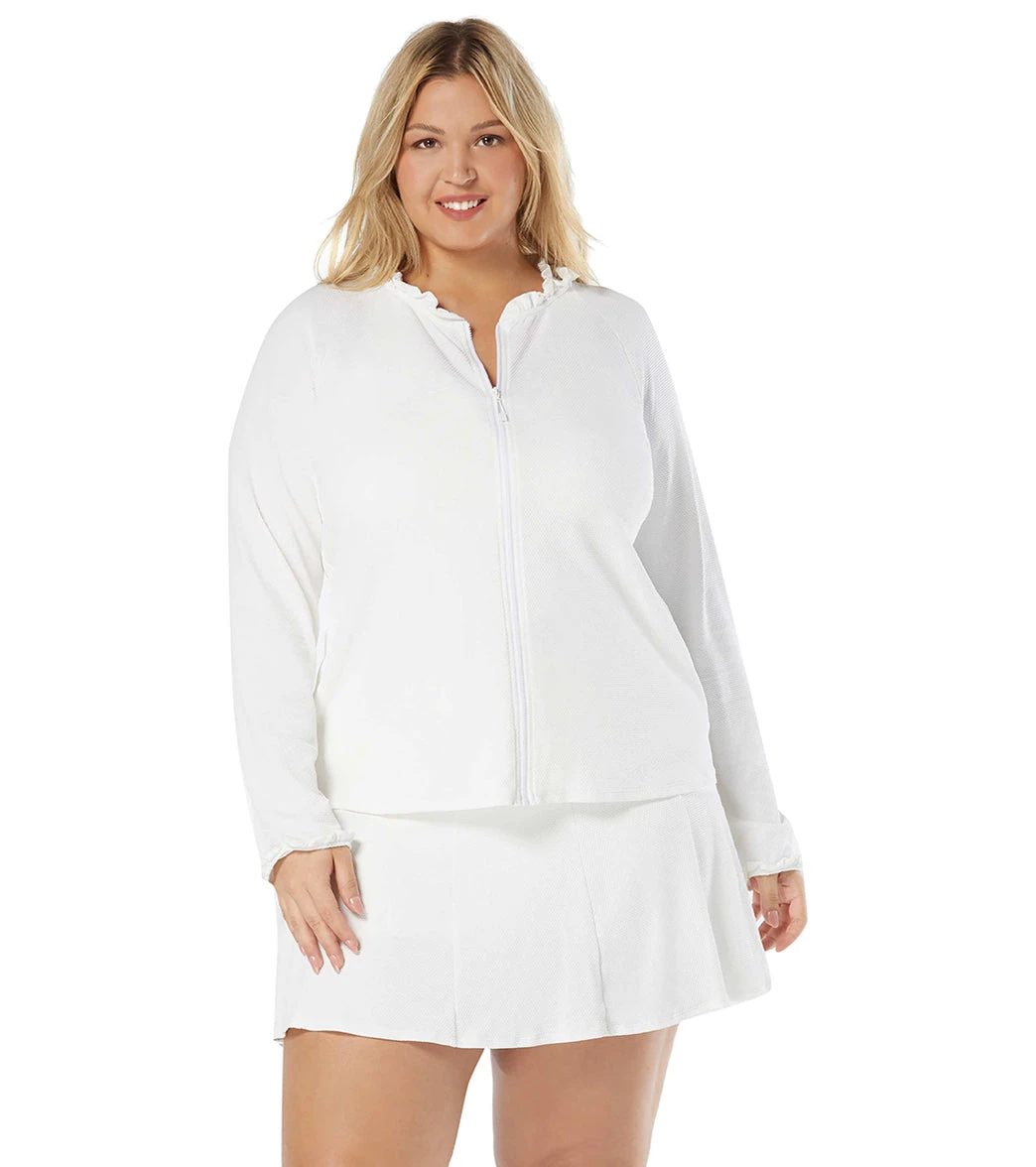 Stay protected from the sun while being fashionable and fun! The Beach House Swim Plus Size Phoebe Relaxed Fit Ruffled Rash Guard in our new soft textured pique fabric is designed to mix and match with your swim or sport and features long sleeves, zip front, 50+ UPF and ruffle trim hem at the neckline and sleeves. Beach House swimwear is designed with high-end fabrics that bend with you for extra comfort, easy fit and shape retention.