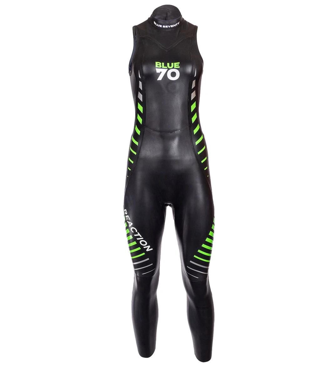 The Blueseventy Women’s 2024 Reaction Sleeveless Tri Wetsuit is designed for triathletes who prioritize flexibility and buoyancy in their swim gear. It features 1.5mm – 2mm neoprene across the shoulders and upper back to ensure unrestricted movement and 4mm – 5mm neoprene in the chest, hips, and upper legs to optimize swim posture and efficiency. This strategic distribution of neoprene thickness makes the sleeveless wetsuit a top choice for enhancing performance in the water.
