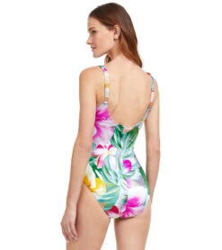 Tropical floral in a 4 way stretch soft satin fabric, the Gottex Women’s Bora Bora Tropical All Over Print Square Neck One Piece Swimsuit is shaped with a knot motif that flatters a women’s silhouette.