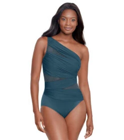 A suit designed exclusively to shape your silhouette and dramatically trim your figure, the Miraclesuit Women’s Network Jena One Piece Swimsuit embodies sophisticated class and unbelievable comfort. Intricate shirring at the waist drapes delicately across mesh netting to create an eye-catching, slender form. A broad one-shoulder strap extends to match its high scoop back, providing you with extra coverage, support, and shape. A shelf bra helps complement the higher neckline while solid hues remain timeless.