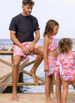 Catch the sunset hues with this frilly skirt girl’s surf suit, designed with a vibrant tropical print that echoes the colors of golden hour. It features a skirt at the waist and a durable pink zip at the back for easy wear. Ideal for young beach explorers, it offers both fun style and practical comfort.
