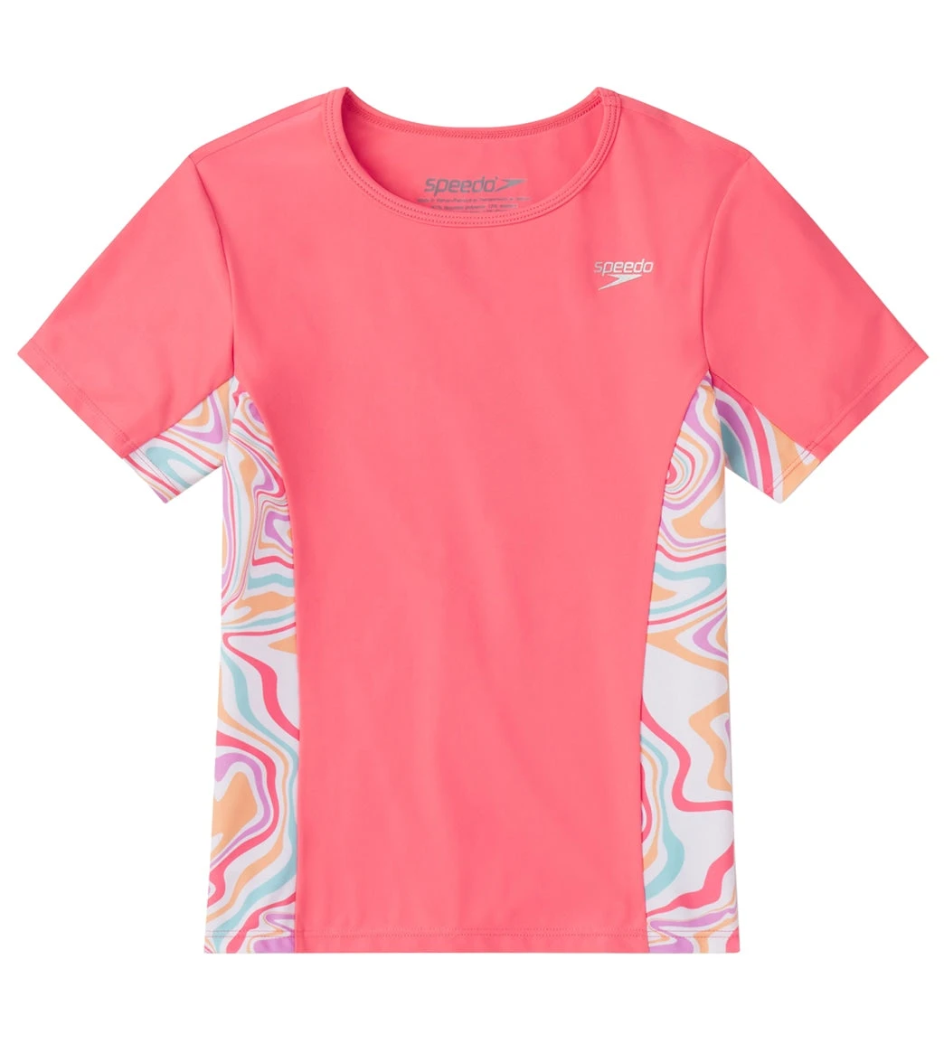 Keep your child protected with the Speedo Girls’ Short Sleeve Printed Splice Rashguard (Little Kid, Big Kid).