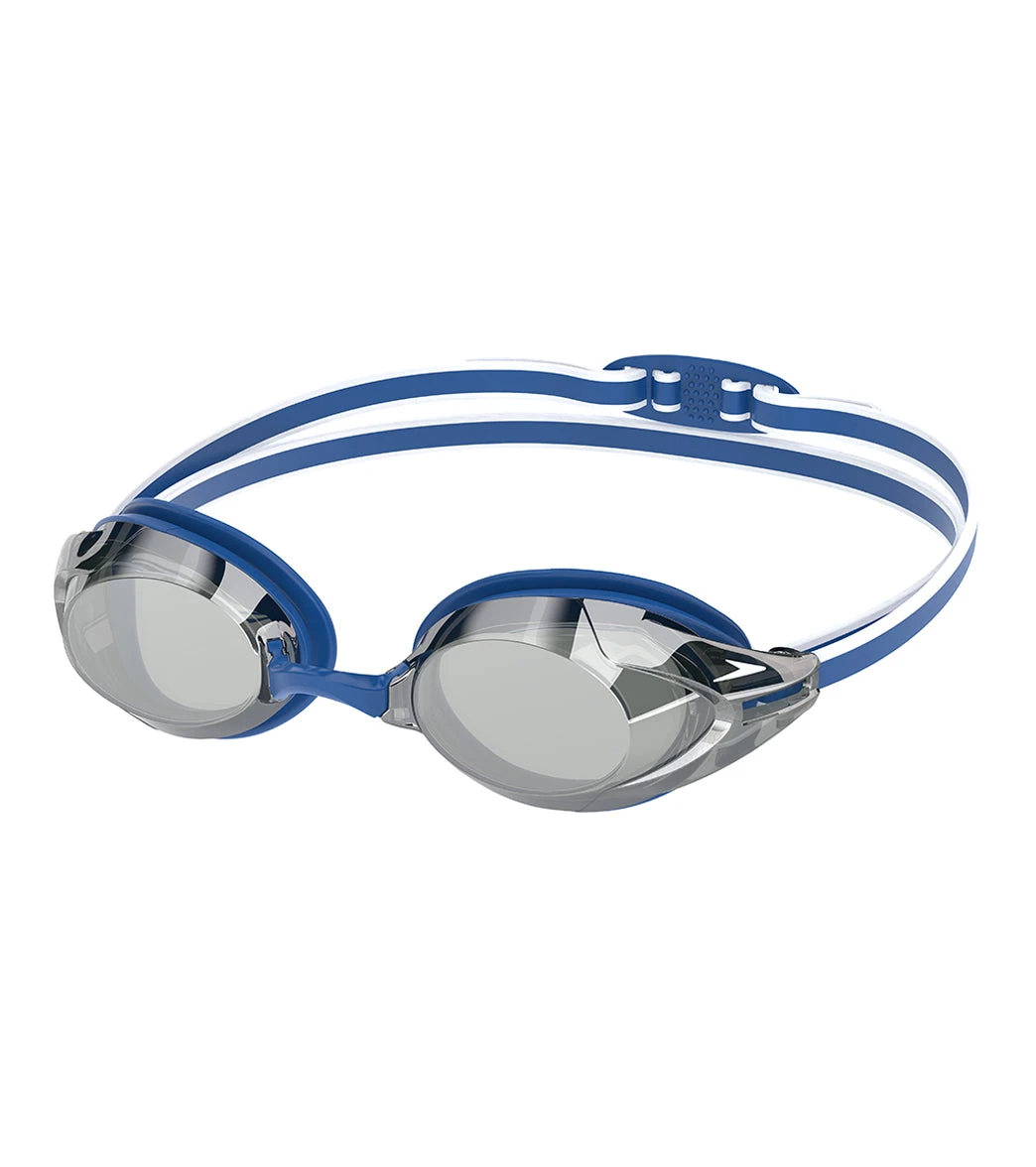 Experience expanded underwater clarity with the Speedo Vanquisher 3.0 Mirrored Goggle, featuring Ocular 360 lenses for a 14% wider field of view. Built with Cushion Fit Tech and a sleek, low-profile design, these racing goggles offer anti-fog, 100% UV protection, and a slide-and-lock nose bridge for easy, secure adjustments.