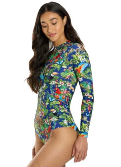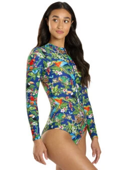 The Sporti Active Tropical Oasis Zip Front Long Sleeve One Piece Swimsuit is perfect for active beach days and water workouts!