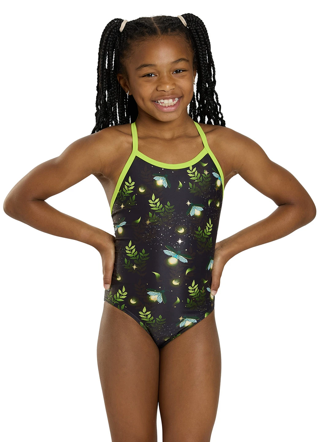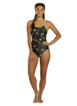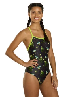 Escape into an enchanted forest with this fun print from Sporti! Made of durable, chlorine-resistant fabric, this swimsuit is made to last while providing complete sun protection. Suit up for swim practice or playtime at the beach in the Sporti Firefly Lane Thin Strap One Piece Swimsuit.
