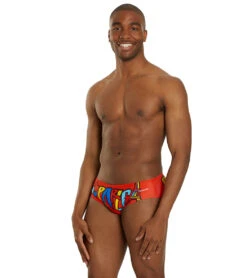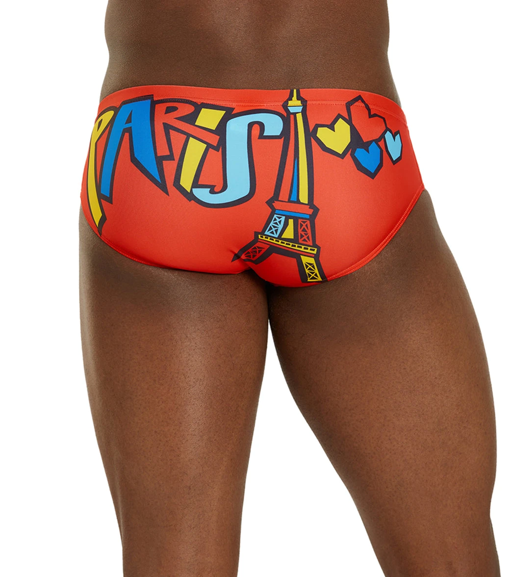 Step into the spotlight with the Sporti Paris Trend Setter Brief Swimsuit. Bold and energetic, this suit features “Paris” in fun, large pop art-esque lettering across a vibrant red background, capturing the city’s fashionable and artistic spirit. The drawcord waist ensures the suit stays perfectly in place, so you can focus solely on your swim, making it perfect for those who lead in and out of the water.