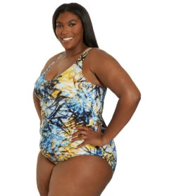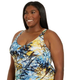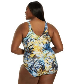 Dive into comfort with the Sporti Plus Size Breezy Palms Conservative Printed Girl Leg One Piece Swimsuit. Ideal for those who seek extra coverage, this swimsuit incorporates Lycra lasting FIT technology for superior protection against degradation from sunscreen, pool water, heat, and body oils. The suit features a tropical palm print in soothing tones, while providing conservative coverage on the front and back sides of this suit. Make a splash with confidence in this flexible and supportive swimsuit.
