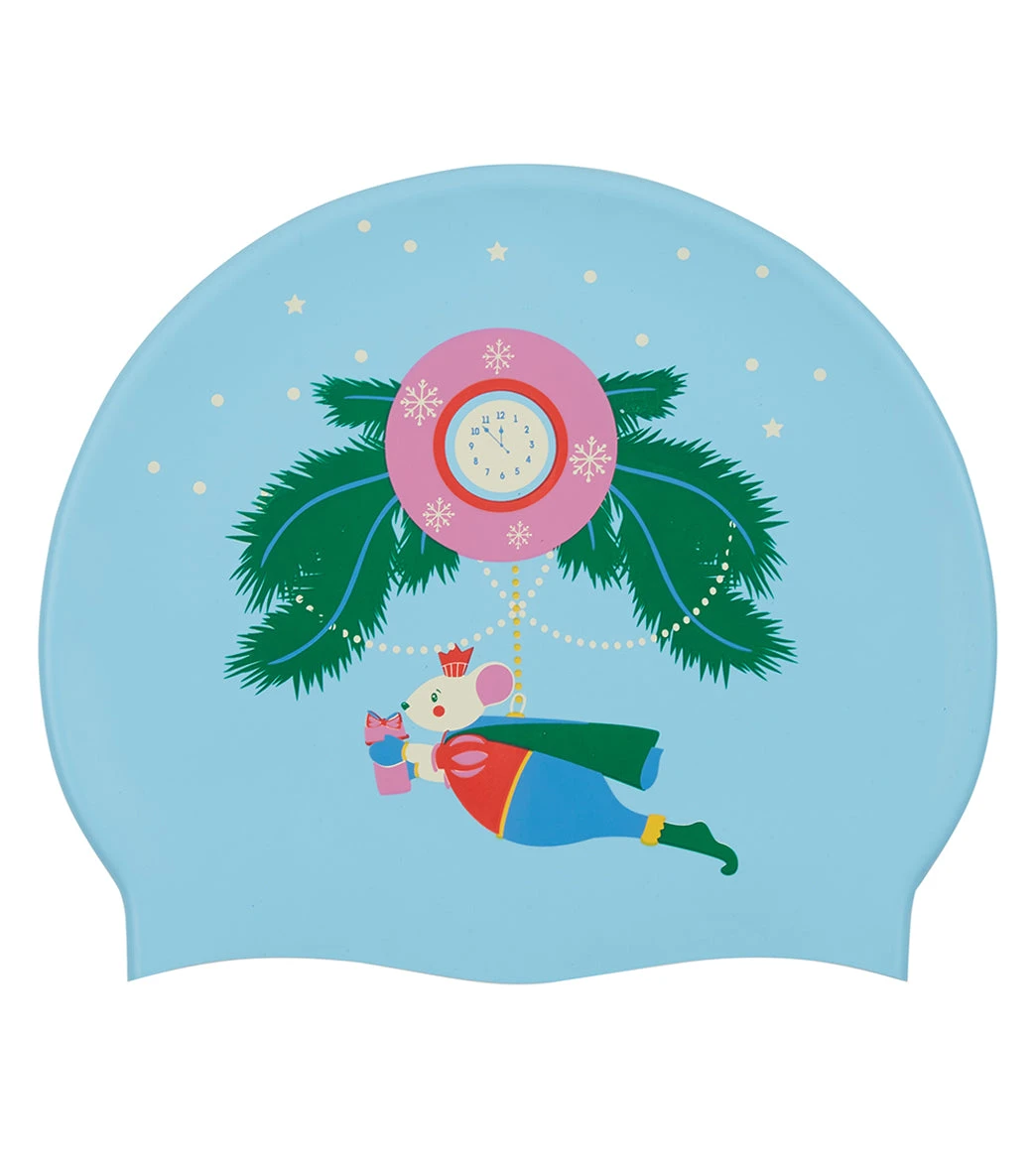 The Sporti Sugar Plum Silicone Swim Cap Jr. is a blue cap featuring an adorable holiday mouse design. Sized for children, it offers a snug fit and anti-slip grip, keeping hair secure and goggles in place. Infuse your practice with a touch of Christmas magic in every lap!