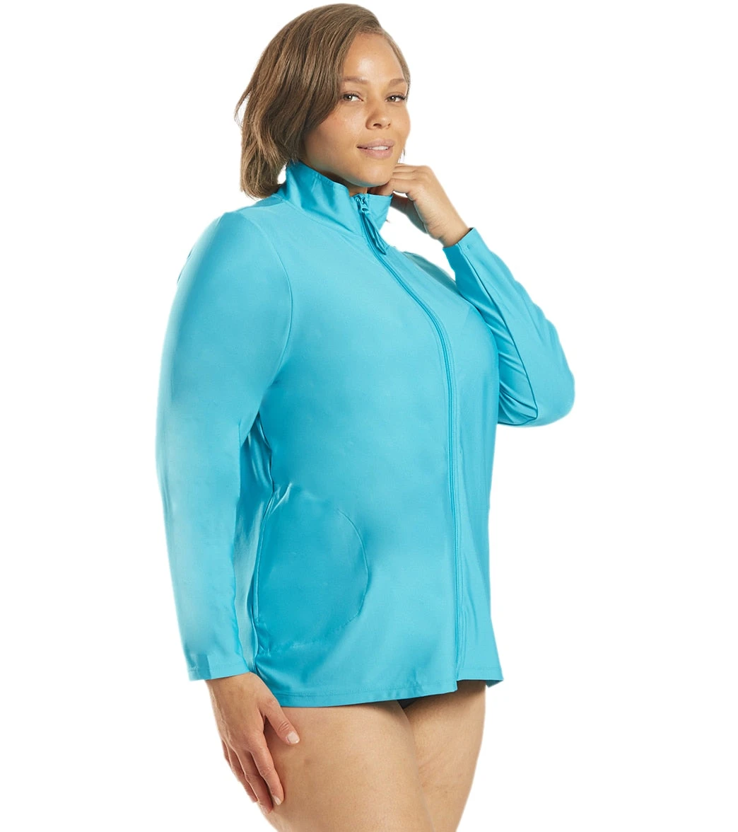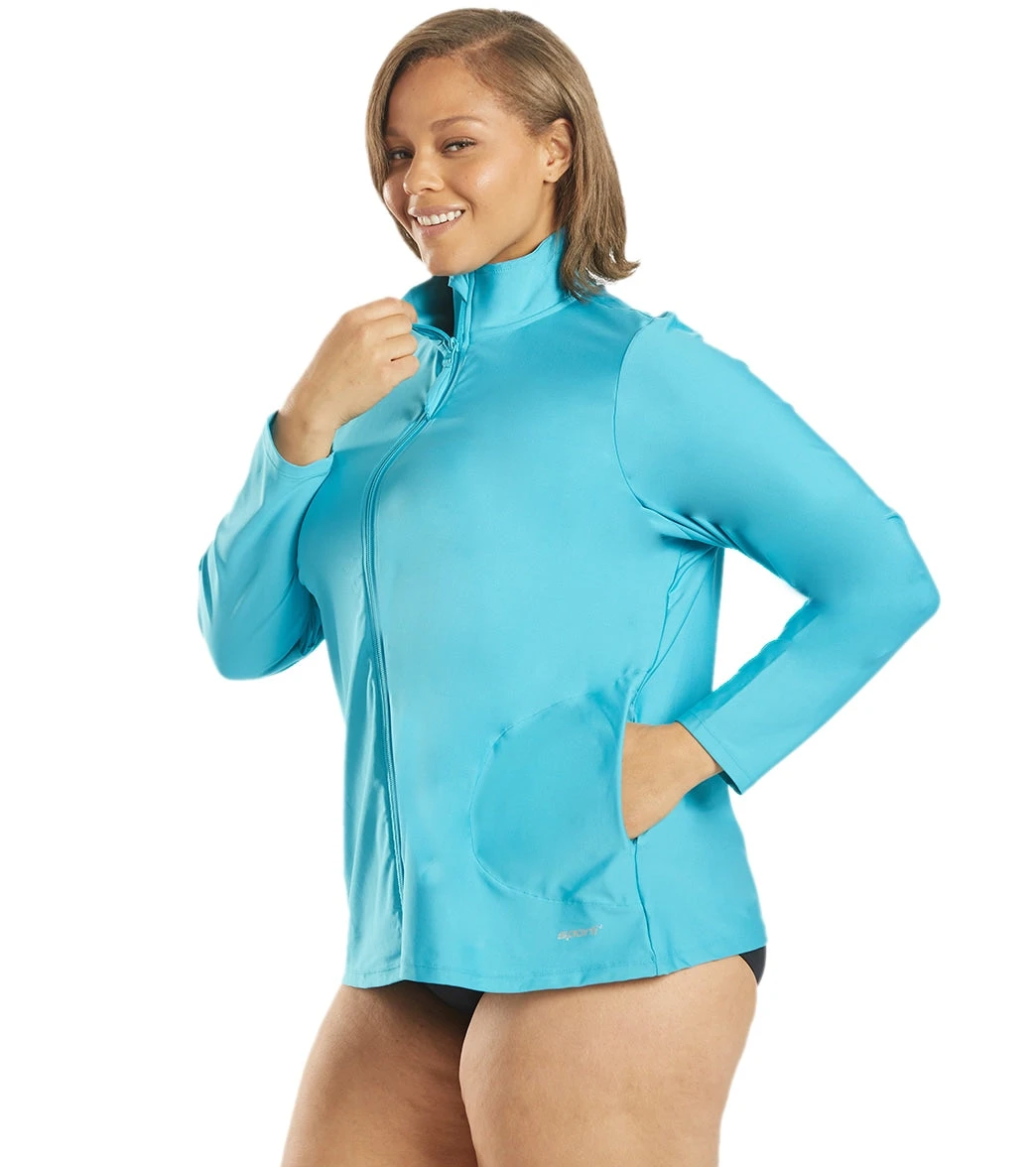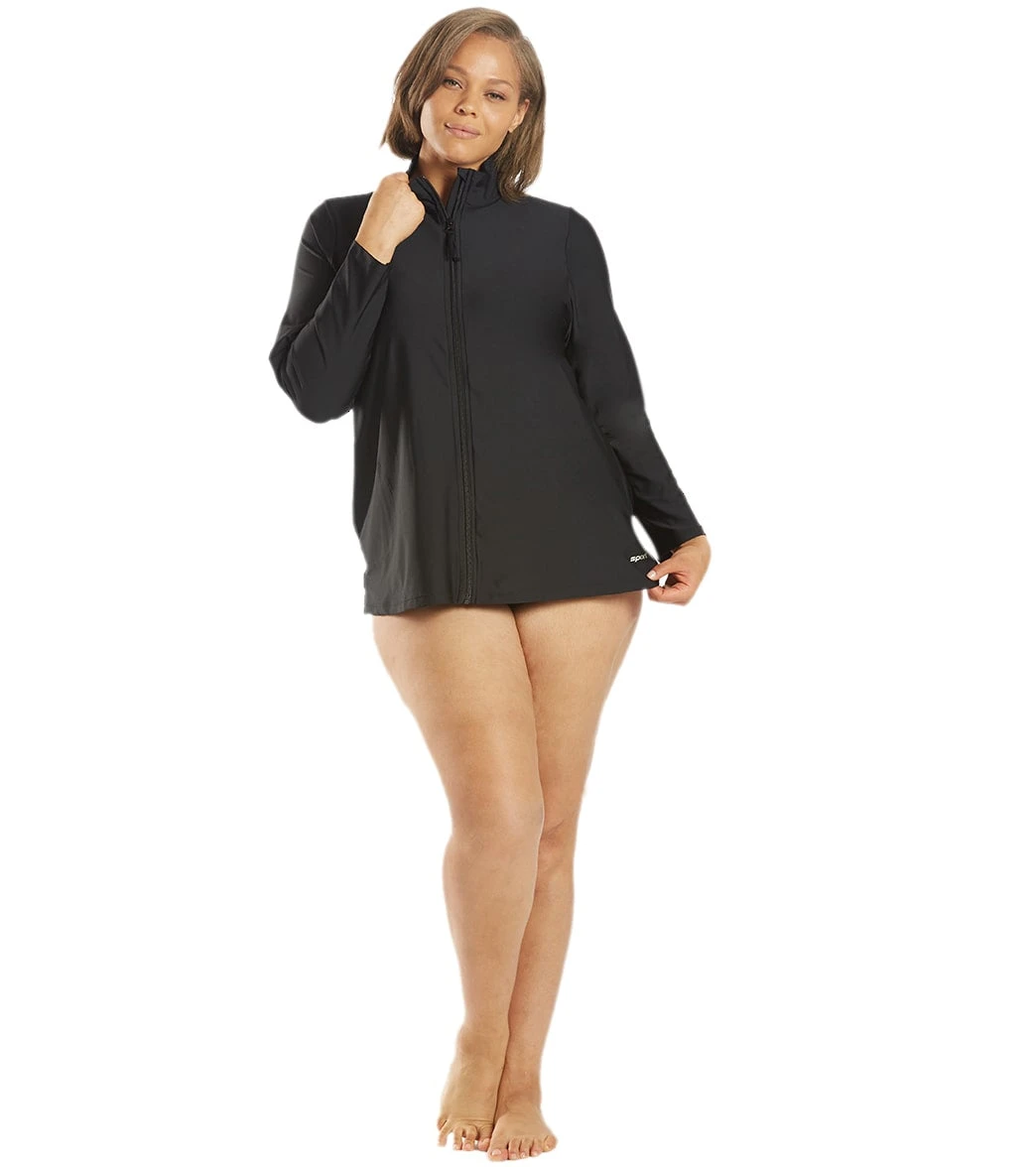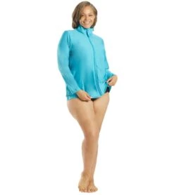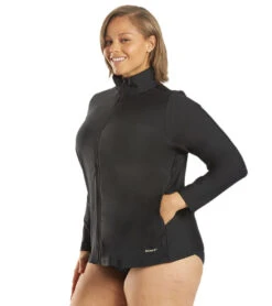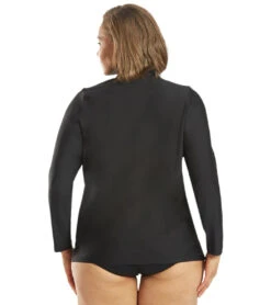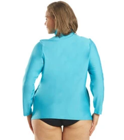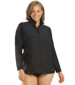 Paddleboard with style in the Block the Sporti Women’s Plus Size L/S Zip Front UPF 50+ Rash Guard. Has a high neck for extra coverage and an exposed full zipper for easy on-and-off.