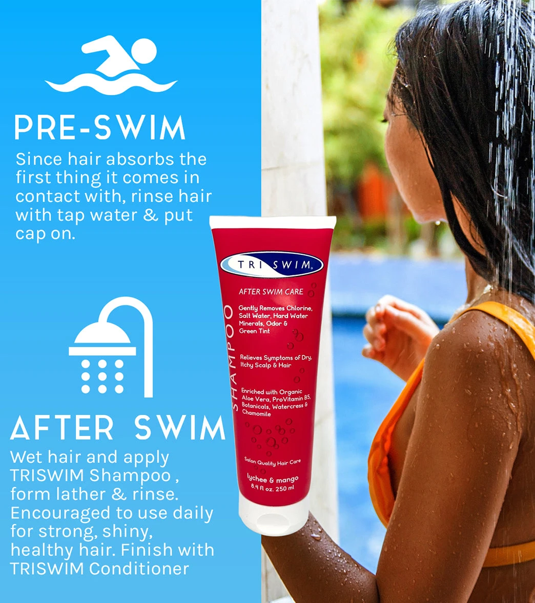 - Instructions: Shampoo hair with TRISWIM Shampoo, lather, and rinse thoroughly. Repeat as desired. For best results, follow with TRISWIM Conditioner. The longer the conditioner stays in the hair, the more moisturized it becomes.Rinse thoroughly. May use every day.
