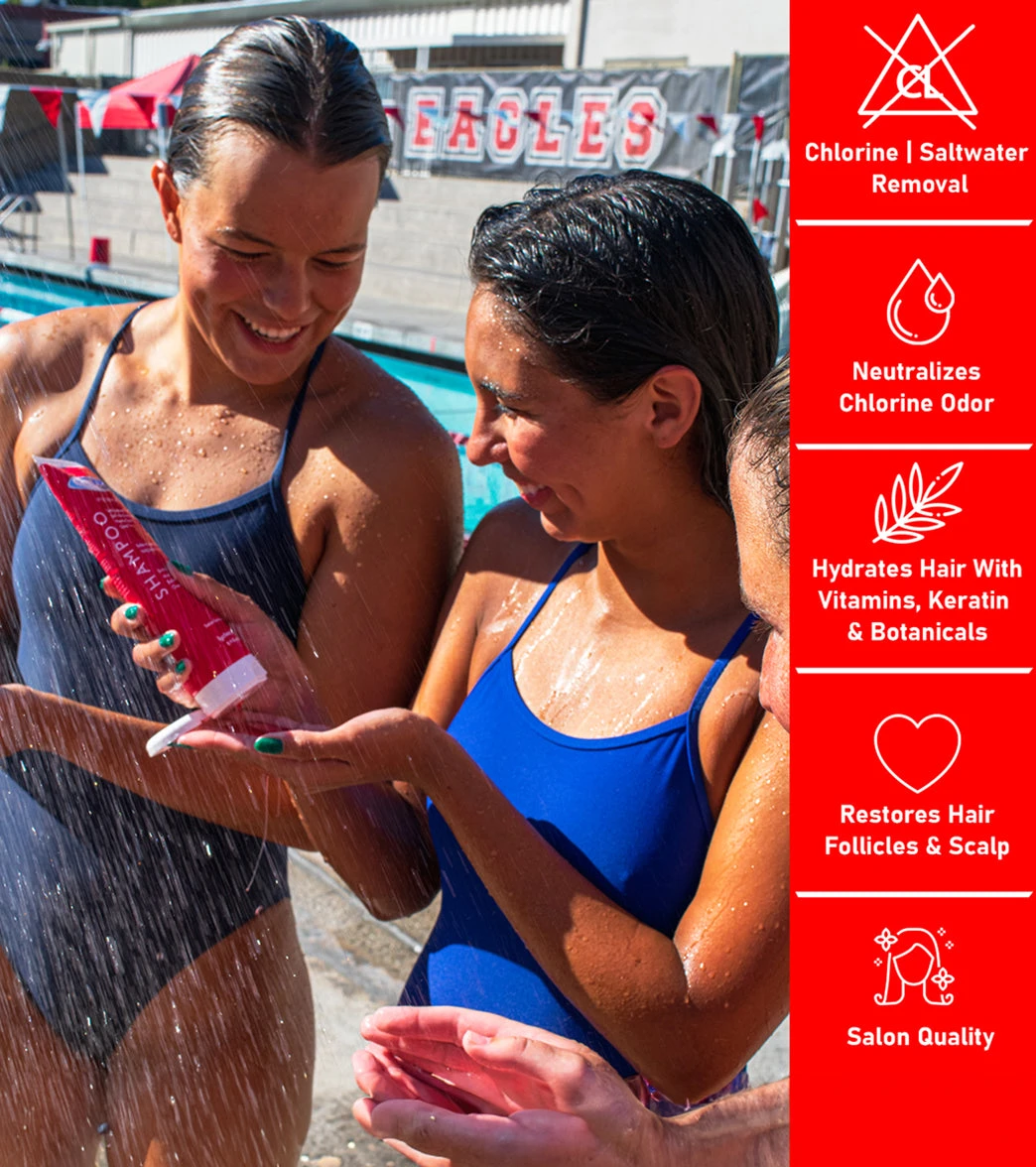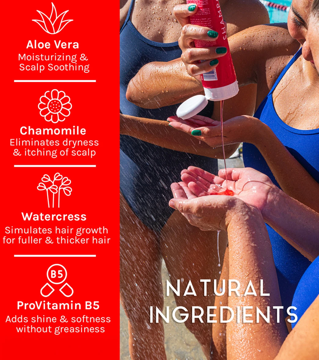 TRISWIM 8.5oz Red Lychee & Mango Shampoo is a new thicker, richer shampoo formula that effectively removes chlorine, bromine, saltwater, hard water minerals, and chlorine odor by sequestering, attacking, and rinsing the irritants out of the hair and down the drain.