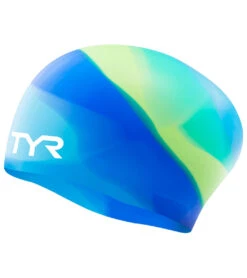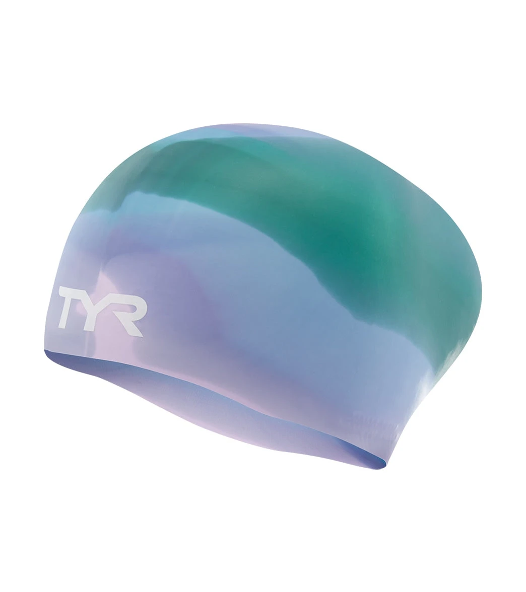 Protect your hair while you swim in the TYR Tie Dye Long Hair Silicone Junior Swim Cap.